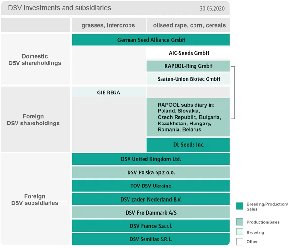 DSV har store andele i kendte virksomheder inden for såsædsindustrien i Tyskland og i udlandet og har datterselskaber i Danmark, Storbritannien, Frankrig, Holland, Polen, Argentina, Ukraine og Canada.