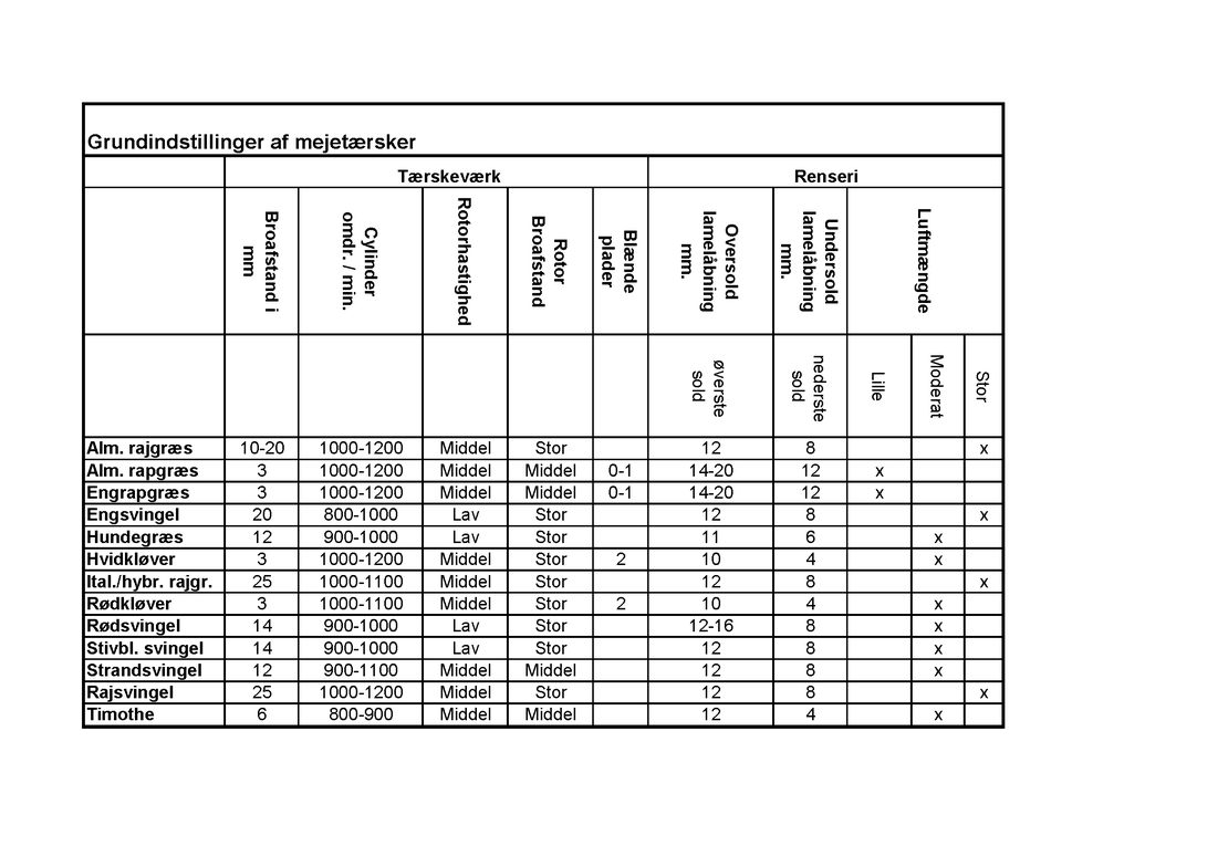 Tabel til indstilling af alle mejetærsker modeller