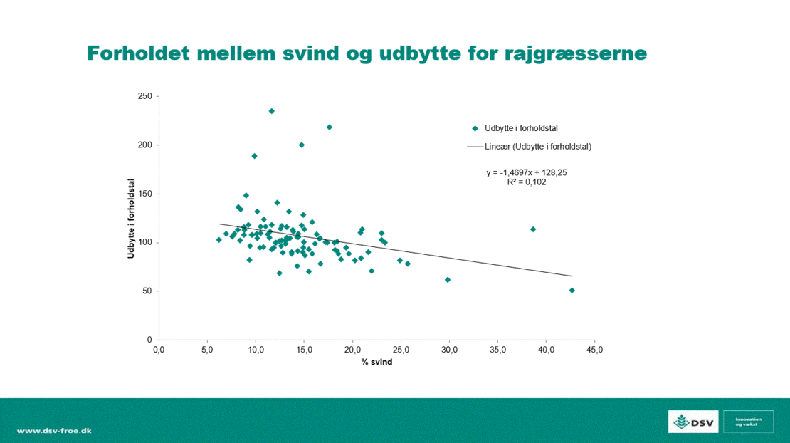 Derfor har vi lavet en lille regressions analyse mellem udbyttet og rense svindet, for de avlere der har fået høstbesøg, hvor vi ved, at der ikke var frøspild fra mejetærskeren.