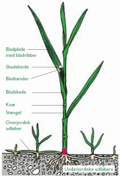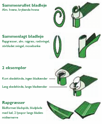 Åben, trind, ofte lidt kølet bladskede, ru foroven ellers glat.